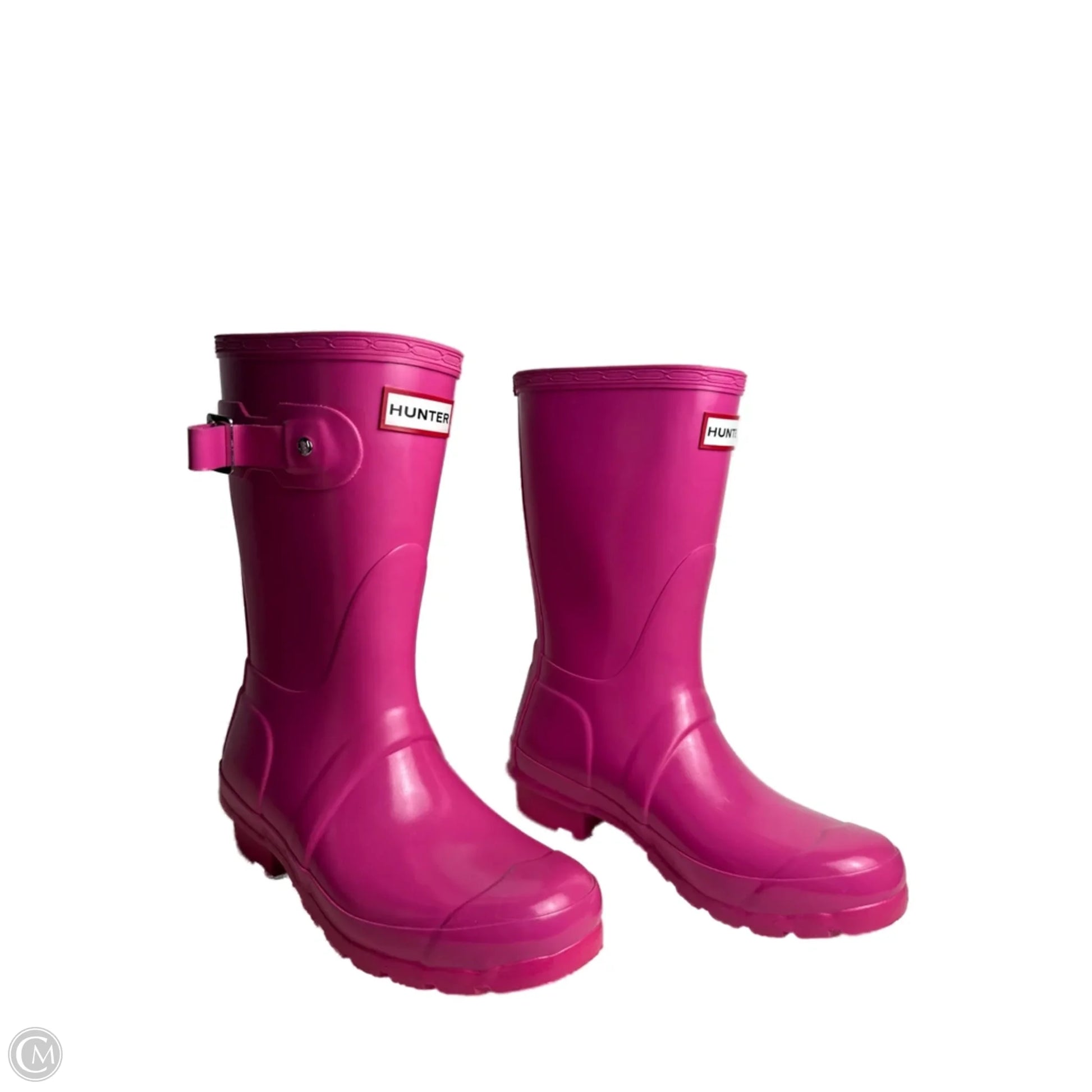 Pink Hunter rain boots, size 5, stylish and functional wet-weather essential.